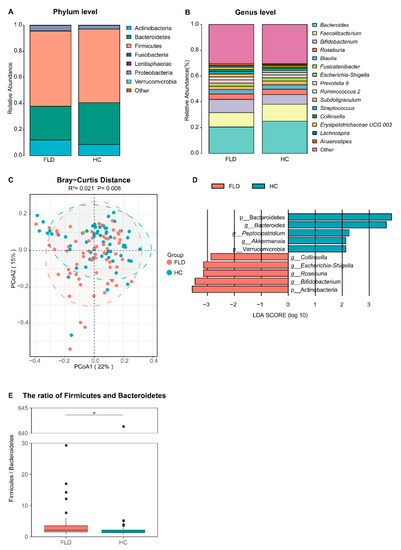 Relative abundance of gut microbiota at the phylum level (A) and the genus level (B). (C) The beta diversity of microbial communities between the children with NAFLD and healthy children was significantly different (R2 = 0.021, p = 0.008). (D) The LEfSe results of the children with NAFLD and healthy children. High abundances of Actinobacteria, Collinsella, Escherichia-Shigella, Roseburia, and Bifidobacterium were found in the gut microbiota of children with NAFLD. The abundances of Bacteroidetes, Verrucomicrobia, Bacteroides, Peptoclostridium, and Akkermansia were higher in the gut microbiota of healthy children. (E) The ratio of Firmicutes and Bacteroidetes was significantly higher in gut microbiota in healthy children than in children with NAFLD, * p < 0.05.