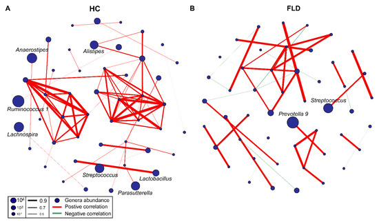 Microbial co-occurrence networks can help us better understand the connections and interactions between genera. The microbial network of the healthy group was composed of 78 edges and 51 nodes. The abundances of Anaerostipes, Ruminococcus 1, Lachnospira, Streptococcus, Parasutterella, Alistipes, and Lactobacillus were high in the network. The interactions between genera were all positively correlated (Figure 2A). While the microbial network of the FLD group is relatively simple (39 edges, 49 nodes), only the abundance of Prevotella 9 and Streptococcus were high. The interactions among genera were weak, and some genera were negatively correlated (positive correlation: 26 edges, negative correlation: 13 edges, Figure 2B). These microbial networks involve complex connections among multiple genera, and further comparisons are needed. We also found a similar trend in the correlation network between genus and clinical indicators. The genera were positively correlated with clinical indicators in the healthy group, such as RBC, WBC, NEUT, and IG. The network structure was relatively complex, with more edges and nodes (Supplementary Figure S2G). Interestingly, we found that the TG was positively correlated with several genera in the FLD group. The numbers of edges and nodes in the FLD group network were less than those in the healthy group network (Supplementary Figure S2H).