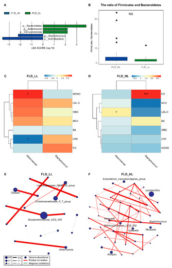 (A) Bacteroidetes, Verrucomicrobia, and Akkermansia were enriched in the FLD_LL group, while Actinobacteria and Staphylococcus were enriched in the FLD_HL group. (B) There was no difference in the ratio of Firmicutes and Bacteroidetes between FLD_HL and FLD_LL groups. (C) In the FLD_LL group, Akkermansia was positively correlated with MONO, and negatively correlated with LYM, * p < 0.05. (D) In the FLD_HL group, Staphylococcus and Akkermansia were positively correlated with EO and LDL-C, respectively, * p < 0.05, *** p < 0.001. (E,F) Microbial networks for FLD_HL and FLD_LL groups.