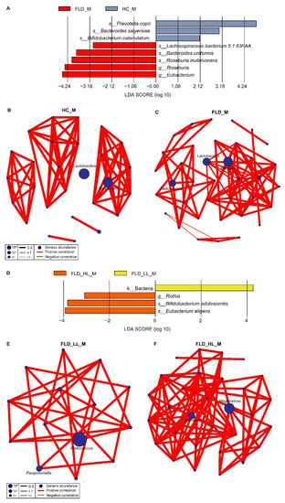 (A) The microbial biomarkers in groups HC_M and FLD_M include Prevotella copri, Bacteroides salyersiae, Bifidobacterium catenulatum, Eubacterium, Roseburia, Lachnospiraceae bacterium 5 1 63FAA, Bacteroides uniformis, and Roseburia inulinivorans. (B,C) Microbiome network of groups HC_M and FLD_M. (D) LEfSe analysis revealed that Rothia, Eubacterium eligens, and Bifidobacterium adolescentis were enriched in group FLD_HL_M. (E,F) Microbiome network of groups FLD_LL_M and FLD_HL_M.