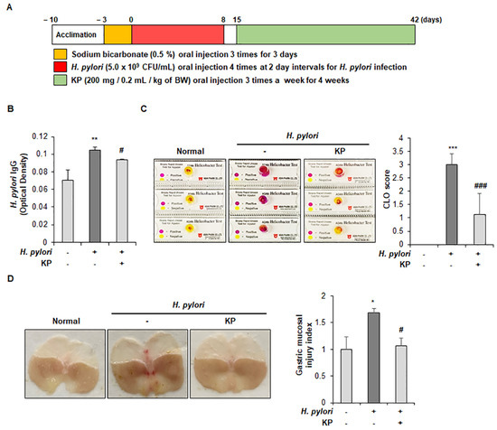 To confirm the maintenance of H. pylori infection, serum was isolated one-week later from venous blood extracted from the tails of all mice. H. pylori numbers were measured using the H. pylori IgG antibody ELISA kit (Cusabio Biotech Co., Houston, TX, USA), and mice with elevated H. pylori IgG levels were subsequently selected. Next, the mice were divided into three groups: Normal group; H. pylori group orally administered with 0.2 mL/kg PBS, 3-times weekly over a 4-week period, performed in triplicate; KP-treated group orally administered with 0.2 mL/kg of 200 mg/kg KP, 3-times weekly over a 4-week period.