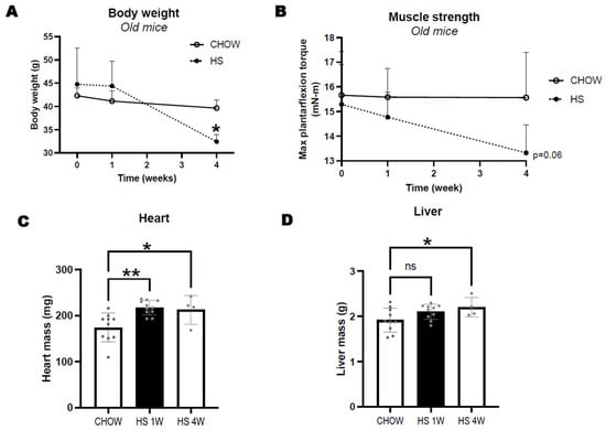 Changes in body weight (A) and maximal isometric torque of plantarflexors (B) in 24-month-old CB6F1 mice consuming either standard chow or high sucrose (HS) diet for 1 or 4 weeks. Differences in heart (C) and liver (D) mass between groups. Data expressed as mean ± SD. Significant differences to age-matched chow are indicated by * p < 0.05, ** p < 0.01, non–significant effects by "ns".