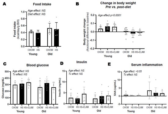 In a second experiment, we compared the effect of 1 week of HS diet on food intake and body weight of young and old mice treated with or without ELAM. Despite a tendency for old mice to consume more calories per body weight than young mice (age effect p = 0.09; Figure 2A), young mice increased their weight and old mice did not. Mice on HS diet did not have a higher caloric intake than those on chow. However, HS diet promoted weight gain in young mice but not in old mice (Table 2, Figure 2B). We did not detect differences in non-fasting glucose or serum insulin levels between groups (Figure 2C,D), though old mice tended to have lower glucose levels (p = 0.1). We also detected an increase in inflammatory marker serum amyloid A (SAA) in old mice, but HS did not increase SAA in either age group (Figure 2E).