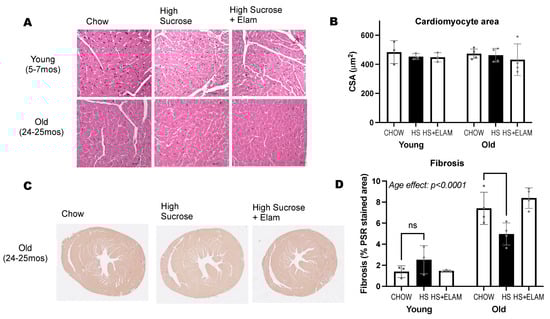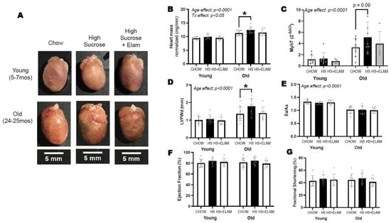 The aging heart is characterized by disrupted metabolism and mitochondrial dysfunction that can increase susceptibility to nutritional stressors []. An important role for mitochondria in the aging heart is supported by recent reports that cardiac hypertrophy and dysfunction in aged rodents can be ameliorated by mitochondrial-targeted therapies, such as elamipretide (ELAM) [,]. ELAM is a synthetic tetrapeptide that associates with the head group of cardiolipin, a phospholipid specific to the inner mitochondrial membrane []. Left ventricular hypertrophy is a well-recognized risk factor for future adverse cardiac events, with greater evidence of pathological cardiac hypertrophy in old age. Sugar consumption promotes cardiac hypertrophy in young mice [,] and exacerbates cardiac pathology in young rodent models of pressure overload [,], but to our knowledge there are no published studies examining the effects of sugar consumption in cardiac health in the context of aging. The purpose of this study was to test whether the aging heart is more susceptible to nutritional stress induced by a high-sucrose diet. We tested the involvement of mitochondria in this interaction by determining whether ELAM can prevent this effect. We found that after only one week of high-sucrose (HS) diet, cardiac hypertrophy was accelerated in aged mice, but young mice and aged mice treated with ELAM were protected.