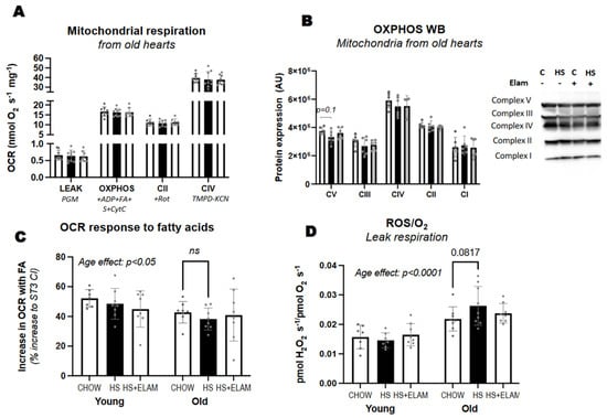 Mitochondrial function needs to be adequate to meet the high metabolic demand of the heart. To determine whether mitochondrial function is affected by HS diet, we measured oxygen consumption rates using high-resolution respirometry of isolated mitochondria in the presence of a variety of substrates. We found no effect of HS diet with or without ELAM on leak respiration in the presence of complex I substrates; maximum oxidative phosphorylation (OXPHOS) measured after adding saturating ADP in the presence of pyruvate, glutamate, malate (PGM), octanoylcarnitine (FA), succinate (S), and cytochrome C; or complex II (+Rotenone) or IV activity (TMPD-KCN) (Figure 4A). We also did not detect differences in protein content of OXPHOS complexes (Figure 4B). We then compared the rise in respiration when adding octanoylcarnitine following the addition of ADP + complex I substrates, and we found an age-related decrease in fatty acid-induced respiration (Figure 4C), indicative of reduced capacity for fatty acid oxidation. However, HS diet with or without ELAM did not aggravate this age-associated effect. Since previous studies have shown that antioxidants can prevent HS-induced cardiac hypertrophy, we measured hydrogen peroxide production by isolated mitochondria in the leak state relative to oxygen consumption. As expected, we found an age-associated increase in ROS/O2 in old mice, but no detectable effect of HS or ELAM (Figure 4D).