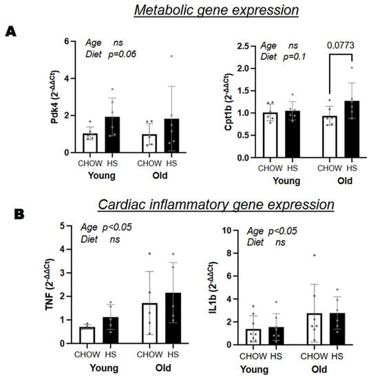 Gene expression and histology of heart tissue. (A) Differences in metabolic and (B) inflammatory genes between diet and age groups; (B). Age and diet effects are indicated with “ns” if above 0.1, with p-value if between 0.05–0.1, and significant if below 0.05. Data expressed as mean ± SD.