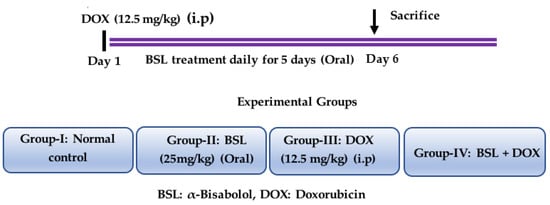 The animals were randomly divided into four experimental groups, each containing 15 rats. α-Bisabolol was diluted in scientific-grade light olive oil (vehicle), and the solutions were freshly prepared just before administration. A single intraperitoneal injection of DOX (12.5 mg/kg body weight) was administered to the rats to induce testicular toxicity. Group I: normal control rats; Group II: rats treated with α-bisabolol (25 mg/kg, intraperitoneally) daily for a period of 5 days; Group III: rats intraperitoneally injected with a single dose of DOX (12.5 mg/kg) to induce testicular toxicity; Group IV: rats administered a single intraperitoneal dose of DOX (12.5 mg/kg) and α-bisabolol (25 mg/kg, intraperitoneally) for five days. After the treatment duration (i.e., on the 6th day), the rats were anesthetized using pentobarbital sodium (60 mg/kg, body weight) and then sacrificed by cervical decapitation. The isolated testis tissues were snap-frozen in liquid nitrogen for the biochemical and immunoblotting experiments. The testicular tissues were also fixed in the 10% neutral buffered formalin for histological studies. Experimental groups and study design is presented in Figure 1.