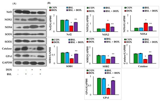 Effect of α-bisabolol on Nrf2 activation and expression levels of NADPH oxidases/antioxidants in DOX-injected rats. (A) Representative images of Western immunoblot analysis for Nrf2, NOX2, NOX4, SOD1, SOD2, catalase, and GPx1. (B) Densitometric analysis of testicular protein expression levels of Nrf2, NOX2, NOX4, SOD1, SOD2, catalase, and GPx1 assessed by Western blot analysis. Columns not sharing a common symbol (*, **) differ significantly from each other (* p < 0.05 vs. normal control, ** p < 0.05 vs. DOX control), CON-Control, BSL-α-Bisabolol, DOX-Doxorubicin, BSL + DOX-α-Bisabolol + Doxorubicin.