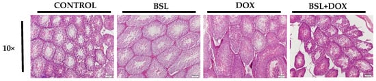 Histopathology of the testis. Testes of normal control rats and rats treated with α-bisabolol alone showed no pathological alterations. Rats treated with DOX alone showed severe derangement of testicular morphology, whereas α-bisabolol pre- and co-treatment reinstated the near normal testicular architecture in DOX-injected rats (10×), CON-Control, BSL-α-Bisabolol, DOX-Doxorubicin, BSL + DOX-α-Bisabolol + Doxorubicin.