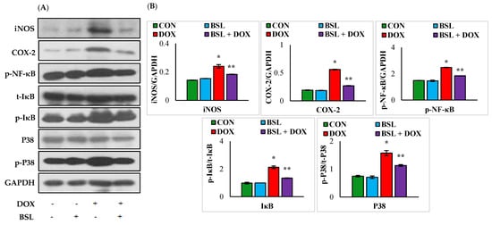 Effect of α-bisabolol on NF-κB/MAPK signaling in the testis. (A) Representative images of Western blot analysis for COX-2, iNOS, p-NF-κB-P65, p-IκBα, IκBα, p-p38, and p38. (B) Densitometric analysis of testicular protein expression levels of COX-2, iNOS, p-NF-κB-P65, p-IκBα, IκBα, p-p38, and p38 assessed by immunoblotting analysis. Columns not sharing a common symbol (*, **) differ significantly from each other (* p < 0.05 vs. normal control, ** p < 0.05 vs. DOX control), CON-Control, BSL-α-Bisabolol, DOX-Doxorubicin, BSL + DOX-α-Bisabolol + Doxorubicin.