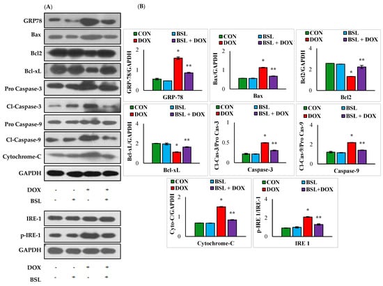 Effect of α-bisabolol on ER-stress-mediated intrinsic pathway of apoptosis in the testis. (A) Representative images of Western immunoblot analysis for Bax, Bcl2, Bcl-xL, procaspase-3, active caspase-3, procaspase-9, active caspase-9, cytochrome-C, IRE-1, and p-IRE-1 (B). Densitometric analysis of testicular protein expression levels of GRP-78, Bax, Bcl2, Bcl-xL, active caspase-3, active caspase-9, cytochrome-C, IRE-1, and p-IRE-1. Columns not sharing a common symbol (*,**) differ significantly from each other (* p < 0.05 vs. normal control, ** p < 0.05 vs. DOX control), CON-Control, BSL-α-Bisabolol, DOX-Doxorubicin, BSL + DOX-α-Bisabolol + Doxorubicin.