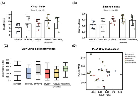 Regarding the alpha diversity, the Chao1 (Figure 1A) and Shannon (Figure 1B) indices at genus level showed no significant differences in bacterial richness and diversity of samples from mice of the experimental groups (control, carnitine, savory, parsley and rosemary groups). In contrast, the Bray-Curtis dissimilarity index showed a significant dissimilarity in the microbial community composition of fecal samples comparing the mean of ranked dissimilarities between and within groups (R = 0.175, p = 0.001, ANOSIM) (Figure 1C). The PCoA of the Bray-Curtis distance matrix based at genus level abundances allowed for representation of the dissimilarities of each sample and showed the percentage of variation explained by the principal coordinates (PCoA1 = 32% and PCoA2 = 19%) (Figure 1D).