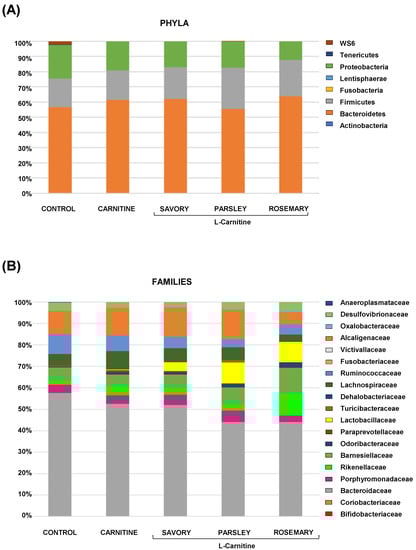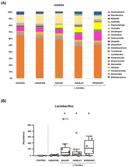 Figure 3. Bacterial profile at the genus level and abundance of Lactobacillus in fecal samples of mice from the treatment groups. (A) Genera; and (B) Lactobacillus. Bars show the relative abundance (%) for each group using 16S rRNA gene sequencing (Ion S5TM System). Dots are individual values and data from the carnitine, savory, parsley and rosemary groups were analyzed using the Kruskal-Wallis rank-sum test (*) p < 0.05 denotes significant differences compared with the carnitine group.