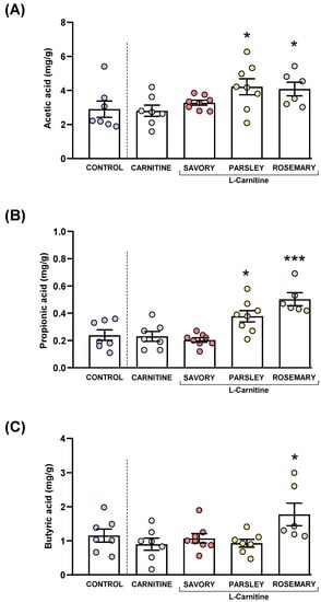 Figure 5. Fecal levels of SCFA species in mice from the treatment groups. (A) Acetic; (B) Propionic; and (C) Butyric acid levels. Dots are individual values. Bars are means ± SEM of SFCA concentrations (mg g−1). Data from the control and carnitine groups were analyzed using Student’s t test. Data from the carnitine, savory, parsley and rosemary groups were analyzed using one-way ANOVA. (*) p < 0.05 and (***) p < 0.001 denote significant differences compared with the carnitine group.