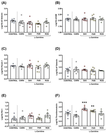 Figure 6. Plasma levels of cardiovascular markers in mice from the treatment groups. (A) sE-Selectin; (B) sICAM; (C) Pecam-1; (D) sP-Selectin; (E) PAI-1; and (F) Thrombomodulin levels. Dots are individual values. Bars are means ± SEM of log10-transformed concentrations of relevant cardiovascular markers (ng mL−1). Data from the control and carnitine groups were analyzed using Student’s t test. Data from the carnitine, savory, parsley and rosemary groups were analyzed using one-way ANOVA. (**) p < 0.01 and (***) p < 0.001 denote significant differences compared with the carnitine group.