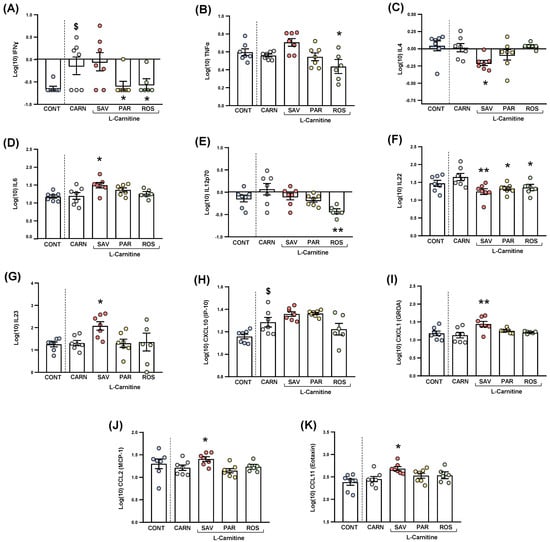 Figure 7. Plasma levels of cytokines and chemokines in mice from the treatment groups. (A) IFNɣ; (B) TNFα; (C) IL−4; (D) IL−6; (E) IL−12p70; (F) IL−22; (G) IL−23; (H) CXCL10 (IP−10); (I) CXCL1 (GROα); (J) CCL2 (MCP−1); and (K) CCL11 (Eotaxin) levels. Dots are individual values. Bars are means ± SEM of log10-transformed concentrations of cytokines and chemokines (pg mL−1). Data from the control and carnitine groups were analyzed using Student’s t test. Data from the carnitine, savory, parsley and rosemary groups were analyzed using one-way ANOVA. ($) p < 0.05 denotes significant differences compared with the control group. (*) p < 0.05 and (**) p < 0.01 denote significant differences compared with the carnitine group.