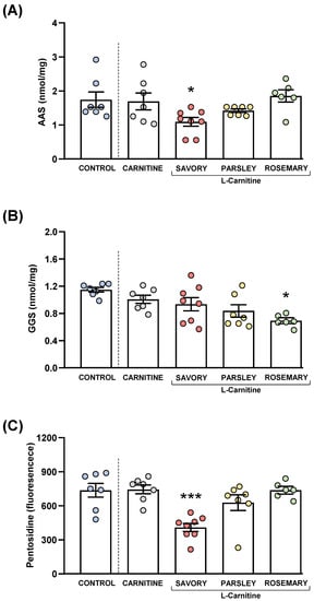 Figure 8. Plasma levels of protein carbonyls and pentosidine in mice from the treatment groups. (A) Aminoadipic semialdehyde (AAS); (B) Glutamic semialdehyde (GGS); and (C) Pentosidine levels. Dots are individual values. Bars are means ± SEM of AAS (nmol mg−1), GGS (nmol mg−1) and pentosidine (fluorescence intensity) concentrations. Data from the control and carnitine groups were analyzed using Student’s t test. Data from the carnitine, savory, parsley and rosemary groups were analyzed using one-way ANOVA. (*) p < 0.05 and (***) p < 0.001 denotes significant differences compared with the carnitine group.