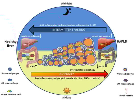 Based on results of observational and clinical studies in other disease states [23,24,25,26,27], it can be postulated that IF would confer metabolic and likely clinical benefits to patients with NAFLD, and clinical evidence is beginning to emerge for use of IF in management of the disease. In this narrative review, we describe current evidence for use of IF in management of NAFLD, as well as potential mechanisms of action, including those related to circadian rhythm, white adipose tissue (WAT), adipokines, the gut microbiome, and autophagy.
