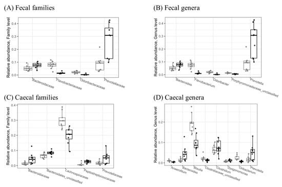 Relative abundances of significantly different (p < 0.05) microbial families (A,C) and genera (B,D) in fecal (A,B) and cecal (C,D) samples collected from the STD (grey) and FG (black) groups of rats (n = 8–9) at the end of the study (week 23). Only taxa with relative abundance > 1% are shown. Statistical significance was evaluated using the Wald test in DESeq2, version 1.30.1.