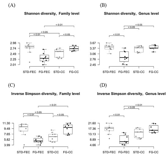 Estimates of Shannon (A,B) and inverse Simpson (C,D) α-diversities of fecal and cecal microbiota at family (A,C) and genus (B,D) levels in the STD (grey) and FG (black) groups of rats (n = 8–9/group) at the end of the study (week 23). Statistical significance was assessed using the Wilcox test.