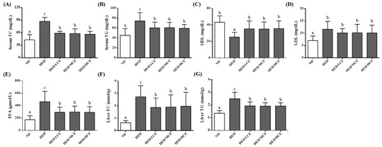 The rats’ serum levels of lipid indices, including TC, TG, high-density lipoprotein cholesterol (HDL-C), low-density lipoprotein cholesterol (LDL-C) and free fatty acids (FFAs) levels, were measured using a Roche Modular P800 (Roche Diagnostics, Indianapolis, IN, USA). Each liver tissue sample was homogenized, and the homogenate was centrifuged at 10,000× g for 10 min at 4 °C. The supernatant was stored on ice for hepatic TG and TC assays. Hepatic TC and TG were measured using an enzyme-linked immunosorbent assay colorimetric assay kit including TC colorimetric assay kit (Elabscience, Houston, TX, USA; Cat. No. E-BC-K109-M) and a TG colorimetric assay kit (Elabscience, Houston, TX, USA; Cat. No. E-BC-K238), respectively.