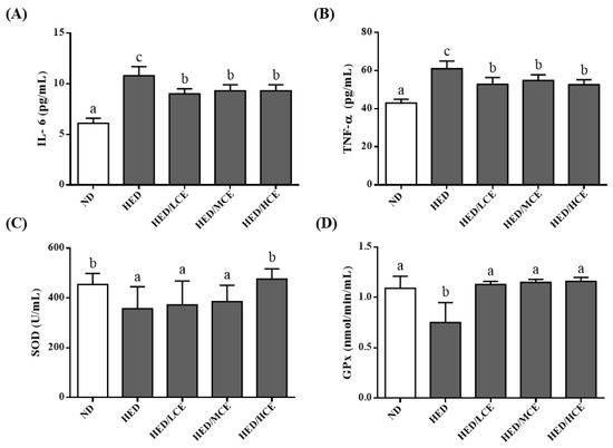 To determine the effects of brown algae crude extract on proinflammatory cytokines and antioxidant enzyme activities, we examined the levels of IL-6 and TNF-α and activities of SOD and GPx in the rats’ serum samples (Figure 3). The HED group had significantly higher IL-6 and TNF-α levels and lower SOD and GPx activities than did the ND group. However, the HED/LCE, HED/MCE, and HED/HCE groups had significantly lower IL-6 and TNF-α levels than did the HED group. In addition, compared with the HED group, the HED/HCE group had significantly higher SOD activity, and HED/LCE, HED/MCE and HED/HCE groups all had significantly higher GPx activity. These results indicated that brown algae crude extract can significantly decrease inflammation and increase antioxidant enzyme activity in serum.