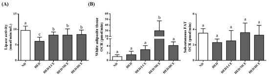 The lipoprotein lipase (LPL) activity of the HED group was much lower than that of the ND group (Figure 4A). The HED/LCE, HED/MCE, and HED/HCE groups had significantly higher LPL activity than did the HED group. In addition, when we assessed mitochondrial function by measuring the rats’ real-time basal OCRs, the subcutaneous fat OCR of the HED group was slightly lower than that of the ND group, and those of the HED/LCE, HED/MCE, and HED/HCE groups were slightly higher than that of the HED groups; however, no significant between-group differences were identified (Figure 4B).