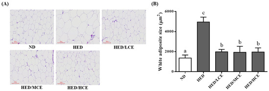 Effect of phlorotannin-rich extracts from A. nodosum and F. vesiculosus on (A) hematoxylin and eosin staining and (B) mean adipocyte size of epididymal white adipose tissue in rats with high-energy diet–induced hyperlipidemia. ND: normal diet; HED: high-energy diet; LCE: low dosage of crude extract; MCE: medium dose of crude extract; HCE: high dosage of crude extract. Values were presented as means ± SD (n = 10). Data were statistically analyzed through one-way ANOVA followed by a Duncan post hoc test. Different letters and symbols indicate significant differences (p < 0.05).