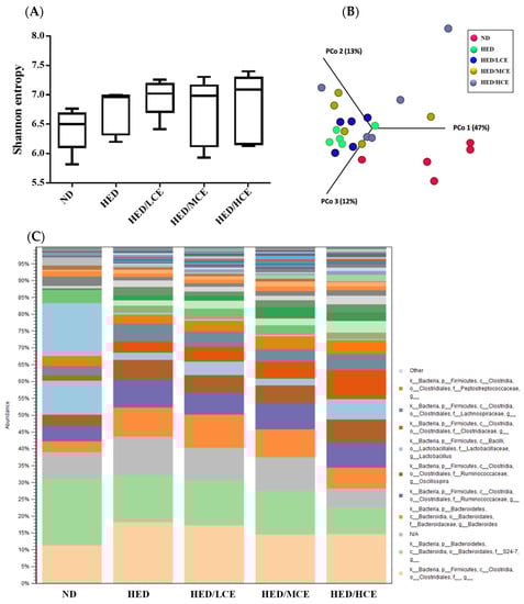 To evaluate the effects of brown algae crude extract on gut microbiota composition, we performed 16S rRNA amplicon sequencing on 25 samples (n = 5/group) (Figure 6). We analyzed the gut microbiota composition of the rats in the ND, HED, HED/LCE, HED/MCE, and HED/HCE groups and observed drastic changes in the microbial ecology in the samples of the rats treated with HED for 12 weeks. Moreover, we performed principal coordinate analysis based on weighted-unifrac distances and discovered a high degree of divergence between the rats fed an ND and HED. Unfortunately, the gut microbiota compositions of the HED/LCE, HED/MCE, and HED/HCE groups were similar to that of the HED group. These results suggested that dietary habits play a crucial role in the modulation of gut microbiota composition and that HED may induce dysbacteriosis in the gut. However, the brown algae crude extract did not alleviate or prevent this dysbacteriosis in the present study.