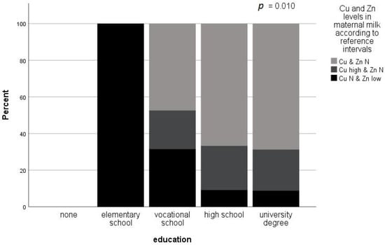 A lower level of education was associated with low Zn levels, while a higher level of education was associated with normal levels of Zn and Cu in maternal milk (Fisher’s exact p = 0.010). The results are presented in Figure 1.
