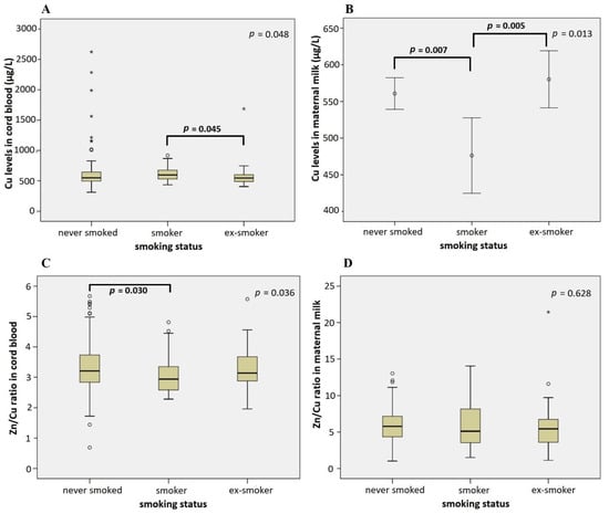Influence of the maternal smoking status on Cu levels in cord blood (A), Cu levels in maternal milk (B), the ratio of Zn/Cu levels in cord blood (C), and the ratio of Zn/Cu levels in maternal milk (D) (Kruskal–Wallis test (A,C,D) and One-way ANOVA (B)). Significant differences between subgroups are denoted using p values of post hoc analysis. Circles denote outliers and asterisks denote extreme outliers.