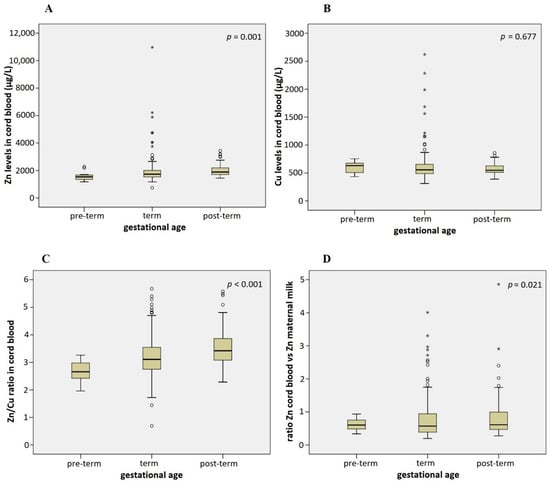 Association of infant gestational age with Zn levels in cord blood (A), Cu levels in cord blood (B), Zn/Cu ratio in cord blood (C), and the ratio between Zn levels in cord blood and maternal milk (D) (Kruskal–Wallis test). Adjusted for maternal age, sex of the infant, smoking status, BMI increase in pregnancy, and marital status in multiple regression models: p = 0.014 (A), p = 0.656 (B), p < 0.001 (C), p = 0.244 (D). Circles denote outliers and asterisks denote extreme outliers.