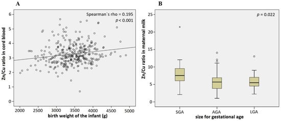 To avoid the confounding effect of correlation between gestational age and birth weight on the results, we also analyzed the data considering size for gestational age. Size for gestational age is a measure of fetal growth, considering epidemiological data of gestational age-appropriate infant birth weight; infants are categorized into three groups accordingly: (1) small for gestational age (SGA), (2) large for gestational age (LGA), and (3) appropriate for gestational age (AGA). In this study, we demonstrated that mothers of SGA infants had higher Zn/Cu ratios (7.5) in maternal milk than mothers of AGA (5.7) and LGA (5.5) infants (p = 0.022) (Figure 4B). This was confirmed after adjusting for maternal age, sex of the infant, smoking status, BMI increase in pregnancy, and marital status in the multi-nominal logistic regression model (AGA vs. SGA p = 0.002, AGA vs. LGA p = 0.468). No such association was present for Zn/Cu ratio in cord blood (p = 0.145).