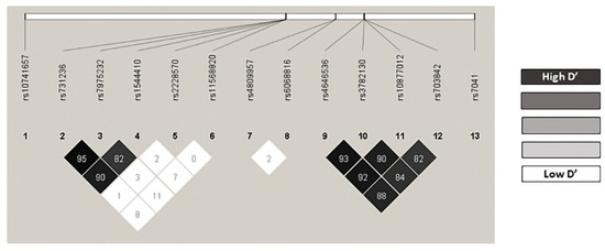 All the genotype frequencies observed agreed with those expected according to the Hardy–Weinberg equilibrium model, with the sole exception of VDR BsmI rs1544410 in the control group (p = 0.0459) (Table S1). We found no statistical differences from those described in the Iberian population for this variant (VDR BsmI rs1544410 A allele: 0.4383 vs. 0.4393; p = 0.9989) [39]. The linkage disequilibrium (LD’) and r2 values are shown in Table S2. In particular, the pairs VDR rs731236/rs7975232 (r2 = 0.545082; D’ = 0.959), VDR rs731236/rs1544410 (r2 = 0.615164; D’ = 0.907), CYP27B1 rs4646536/rs3782130 (r2 = 0.850829; D’ = 0.933), CYP27B1 rs4646536/rs10877012 (r2 = 0.815743; D’ = 0.925), and CYP27B1 rs3782130/rs10877012 (r2 = 0.783361; D’ = 0.901) were in strong linkage disequilibrium (Figure 1). All the polymorphisms show minor allele frequencies (MAFs) greater than 1% and none of them was excluded from the analysis (Table S3). The haplotype frequency estimates are presented in Table S4.