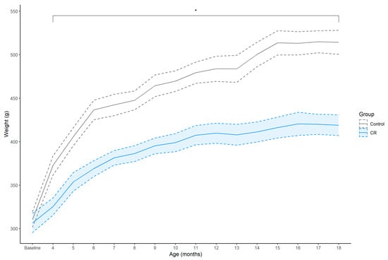Mean ± SEM (shaded area) weekly body weight (g) of control (n = 7) and calorie restriction (CR) (n = 8) treated males. Asterisk (*) indicates that between-group effect is not practically equivalent to zero at each time point.