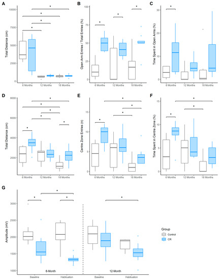Boxplots indicate median and quartile range across the 6-, 12-, and 18-month of age testing timepoints. (A) distance travelled (cm), (B) frequency of entries, and (C) time spent (%) in the open arms of the EPM; (D) distance travelled (cm), (E) frequency of entries, and (F) duration of time spent (%) in the centre of the OF; (G) Mean startle amplitudes (mV) to the startle pulse (120 dB) during baseline and habituation sessions of the acoustic startle test for the control and CR treated males (n = 7–8 per group). Asterisk (*) indicates that effect is not practically equivalent to zero.