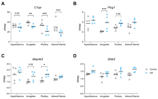 Dot plots visualising the expression of genes in the transcriptomic signature of CR (A) C1qa, (B) Plcg1, (C) Map4k2, and, (D) Zbtb2, derived from attribute weighting models, in the hypothalamus, amygdala, pituitary, and adrenal glands of control and CR rats (n = 5/group/region). Attribute weighting was successful in the selection of genes with a similar trend of response to long-term CR across different tissues. Values are gene expression based on FPKM (fragments per kilobase of exon per million mapped fragments) values. p value * ≤ 0.05; ** ≤ 0.01 *** ≤ 0.001.