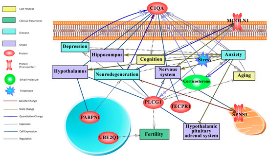 Text mining-derived network of the CR responsive genes, as identified by the attribute weighting analysis, with behaviour (e.g., anxiety, depression, etc.), ageing (e.g., neurodegeneration), regions/systems (e.g., hypothalamus, HPA system), fertility and stress. Detailed relationships, cellular locations, references, and mined sentences are provided in File S4. Integrated network shows that six genes from the attribute weighting analysis (C1qa, Pabpn1, Ube2q1, Plcg1, Tecpr1, Mcoln1) showed relationships with search terms. Among those, C1qa and Plcg1 appeared most important for anxiety and depression. Note: ⨁ denotes positive relation; ⊣ denotes inhibitory relation.