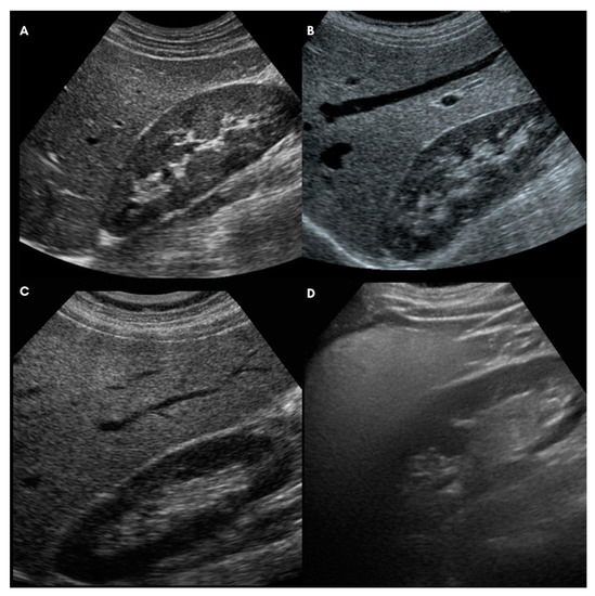 Ultrasound grading of hepatic steatosis: (A) Normal Liver (score 0); (B) Mild Steatosis (score 1–4); (C) Moderate Steatosis (score 5–8); (D) Severe Steatosis (score 9–12).