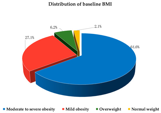 The baseline characteristics of study participants are shown in Table 2. The patients were predominantly men (54.2%), with a male-to-female ratio (1.2:1). The median values of BMI (36.9 kg/m2) and WC (120 cm) suggested a high prevalence of central obesity among the study participants, who also exhibited clinically relevant insulin resistance (median HOMA-IR value 5.5; normal range 0.23–2.5). According to baseline BMI, patients were classified as normal weight (BMI < 25 kg/m2) only in 2.1% of the cases, overweight (25 < BMI < 30 kg/m2) in 6.2%, with mild obesity (30 < BMI < 35 kg/m2) in 27.1%, and moderate-to-severe obesity (BMI ≥ 35 kg/m2) in 64.6% (Figure 2).