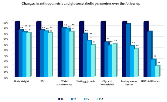 Values are expressed as a percentage of changes in anthropometric (Body Weight, BMI, Waist Circumference), and glucometabolic (Fasting Glycemia, Glycated Hemoglobin, Fasting Serum Insulin, and HOMA-IR index) parameters compared to the baseline (T0 = 100%). Changes versus T0: ** p < 0.01. Changes versus former time: # p < 0.05; ## p < 0.01. Abbreviations: BMI = Body Mass Index; HOMA-IR = homeostasis model assessment of insulin resistance.
