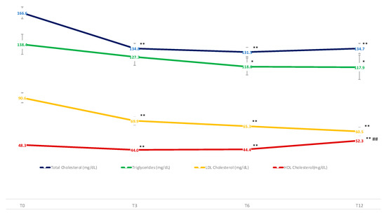 Mean changes in serum values of Total Cholesterol, Low-Density Lipoprotein (LDL) Cholesterol, High-Density Lipoprotein (HDL) Cholesterol, and Triglycerides (mg/dL) through the study period. Means are reported as Least Squared Means estimated by Mixed Model analysis. Variation versus T0: * p < 0.05; ** p < 0.01. Variation versus previous time: ## p < 0.01.