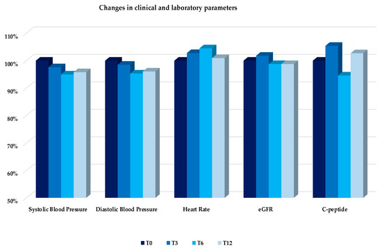 Mean changes, expressed as percentage changes from T0, in clinical parameters, eGFR, and serum C-peptide over the follow-up (T0, T3, T6, T12). No statistically significant changes have been found. Abbreviation: Glomerular filtration rate (eGFR).