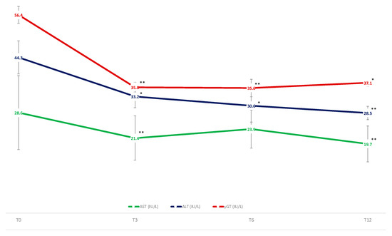 Mean changes in serum values of AST, ALT, and γGT (U/L) over the study period. Means are reported as least squared means estimated by mixed model analysis. Variation versus T0: * p < 0.05; ** p < 0.01. Abbreviations AST: ASpartate aminoTransferase; ALT: ALanine aminoTransferase; γGT: gamma-glutamyl transferase.