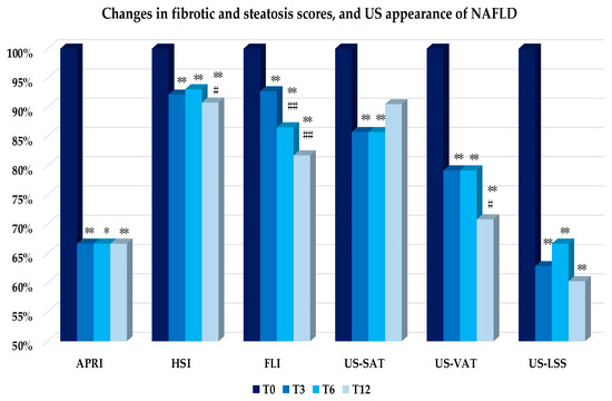 Mean changes, expressed as percentage changes from T0, in biometrical indices of hepatic fibrosis (APRI) and steatosis (HSI, FLI), and US parameters (US-SAT, VAT, and LSS) over the follow-up (T0, T3, T6, T12). Variation versus T0: * p < 0.05; ** p < 0.01. Variation versus previous time: # p < 0.05; ## p < 0.01. Abbreviations: APRI: Aspartate aminotransferase to Platelet Ratio Index; HSI: Hepatic Steatosis Index; FLI: Fatty Liver Index; US: ultrasound; SAT: Subcutaneous Adipose Tissue; VAT: Visceral Adipose Tissue; LSS: Liver Steatosis Score.