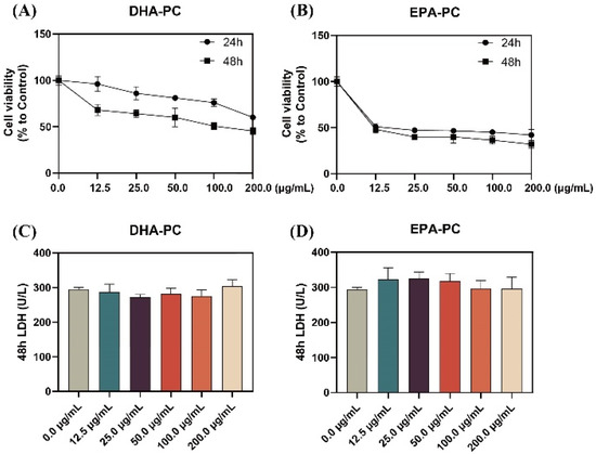 As shown in Figure 1A,B, the proliferation of 95D cells was significantly limited with increasing doses of DHA-PC or EPA-PC during the 24 h and 48 h interventions of the extracted compound, with EPA-PC showing better inhibition (IC50, 9.9 μg/mL). Extracellular LDH release is a marker of cell cytotoxicity. The LDH content was measured in the supernatant of 95D cells after receiving the extracted compound for 48 h. The results showed that the extracted compound did not notably exhibit toxicity to 95D cells (Figure 1C,D). Based on the proliferation inhibition results, the groups (50 μg/mL and 100 μg/mL) were selected for subsequent experiments.