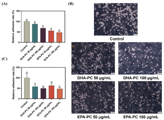 DHA-PC and EPA-PC suppressed the adhesion of 95D cells to ECM and HUVECs. (A) Quantification of 95D cells adhered to the Matrigel. (B) The representative images of 95D cells adhered to the HUVECs monolayers (Scale bar: 100 μm). (C) Quantification of 95D cells adhered to the HUVECs monolayers. Different letters (a, b, c, and d) indicate remarkable differences at p < 0.05 among all groups determined by ANOVA (Bonferroni’s test).