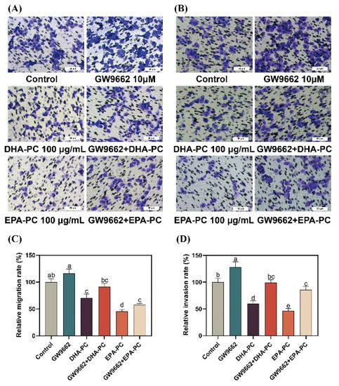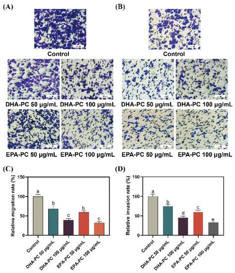 DHA-PC and EPA-PC suppressed the migration and invasion ability of 95D cells. (A) The migrated cells were photographed under the microscope (Scale bar: 50 μm). (B) The invaded cells photographed were under the microscope (Scale bar: 50 μm). (C) Quantitative analysis of migrating cells. (D) Quantitative analysis of invaded cells. Different letters (a, b, c, d, and e) indicate remarkable differences at p < 0.05 among all groups determined by ANOVA (Bonferroni’s test).