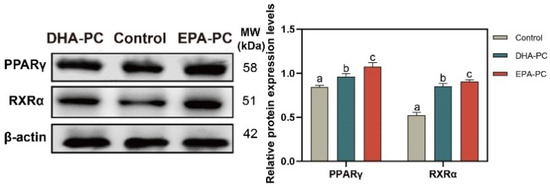 DHA-PC and EPA-PC increased the protein levels of PPARγ and RXRα. The expression of PPARγ and RXRα. Different letters (a, b, and c) indicate remarkable differences at p < 0.05 among all groups determined by ANOVA (Bonferroni’s test).
