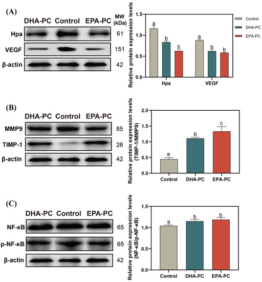 DHA-PC and EPA-PC suppressed protein expression of crucial transcription factors of the invasion and adhesion. (A) the expression of Hpa and VEGF. (B) the expression of MMP9 and TIMP-1. (C) the expression of NF-κB and p-NF-κB. Different letters (a, b, and c) indicate remarkable differences at p < 0.05 among all groups determined by ANOVA (Bonferroni’s test).